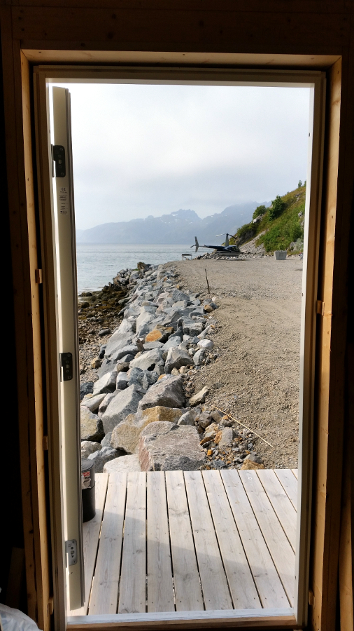 Helicopter outside the new rorbu door